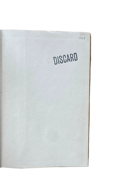 Vintage hardcover. Dust jacket cover shows some shelf wear with small tear at top right corner and some scratching and wear along edges and corners. Spine has some tears/missing pieces at top and bottom ends with signs of shelf wear. Back cover shows some shelf wear with small tears at top and bottom right corners. Flyleaf has "Discard" stamp. Red board covers are clean with some bumping to spine ends. Very good book in fair jacket.