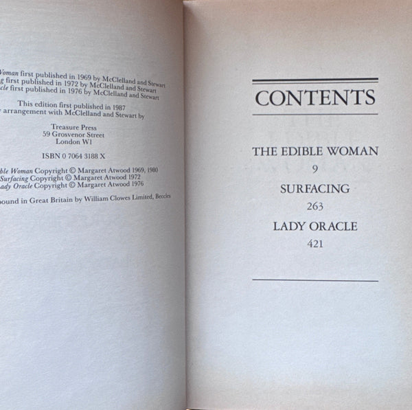 The Edible Woman, Surfacing, Lady Oracle, Margaret Atwood. Great Writers of Canada. McClelland and Stewart, 1987.