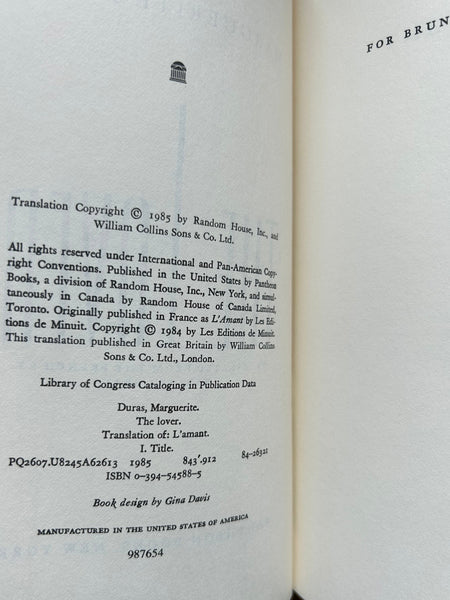 The Lover, Marguerite Duras. Pantheon, 1985. First American Edition.
