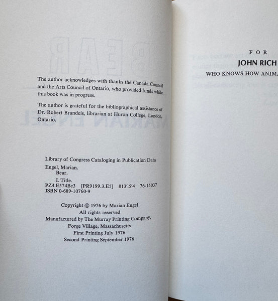 Bear, Marian Engel. Atheneum, 1976. First American edition, second printing.
